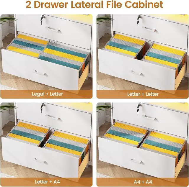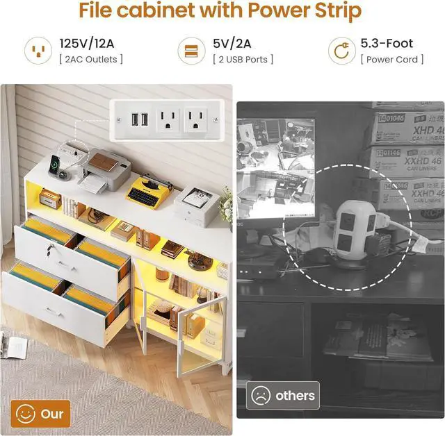 What Can You Get? The file cabinet has 2 file drawers with 1 lock for Legal, Letter, A4 sizes standard file, power strip for charging 4 devices at the same time, spacious desktop(59"L) large enough for printers and scanners, 4 storage shelves, a pair of acrylic cabinet door for protecte documents and LED light. Filing cabinet that can be combined with any computer desk to form an L-shaped office area.