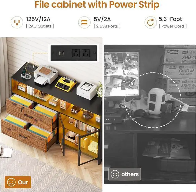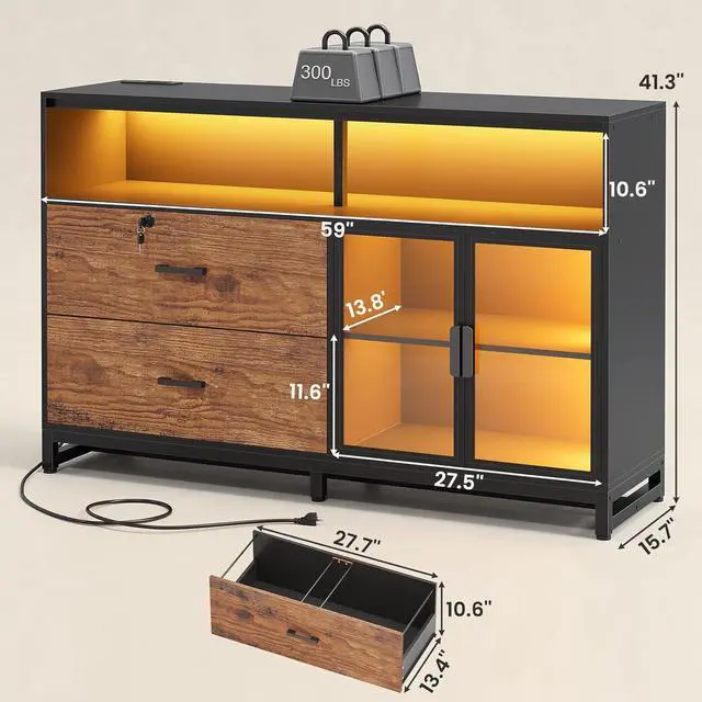 What Can You Get? The file cabinet has 2 file drawers with 1 lock for Legal, Letter, A4 sizes standard file, power strip for charging 4 devices at the same time, spacious desktop(59"L) large enough for printers and scanners, 4 storage shelves, a pair of acrylic cabinet door for protecte documents and LED light. Filing cabinet that can be combined with any computer desk to form an L-shaped office area.