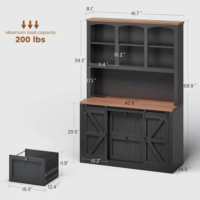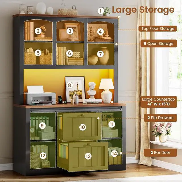 Ample Storage for Your Home Office41" W x 14.9" D x 68.9" H filing cabinet is the perfect storage solution. The farmhouse file cabinet keeps your office organized with two drawers for important documents and open shelves for displaying books or other home office items. There's plenty of space for all your essentialsprinter,files, supplies, and equipment.
