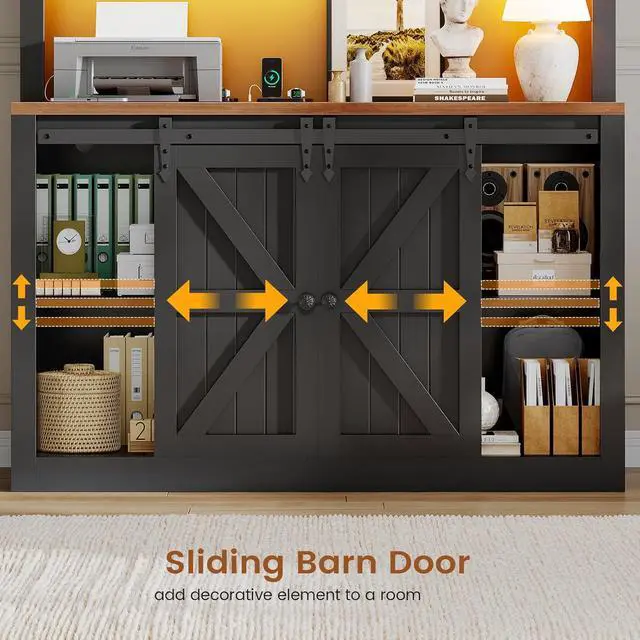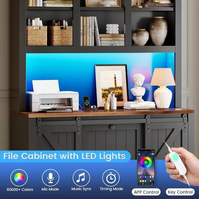 Barn Door Cabinet & LED Light This file cabinet features a sliding barn door design that effectively keeps dust out while adding a stylish decorative touch to your home. The RGB LED strip adapts to your different needs by remote control via APP. Choose warm tones for focused work, or switch to vibrant colors to create an immersive gaming atmosphere.