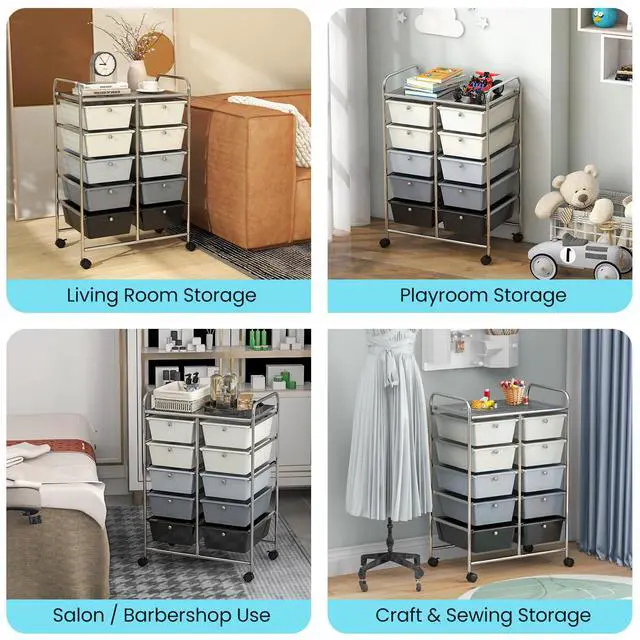 Ample Storage Space: With 1 large top platform (23" L x 14.5" W) and 10 practical drawers (13" L x 10" W x 5" D), this rolling storage cart provides you with roomy space to store different items.