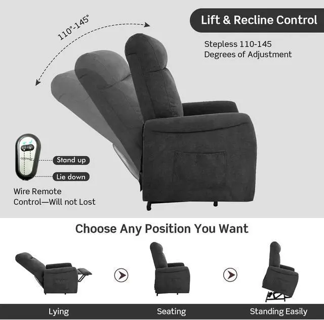 • Personalized Reclining Positions: Coming with a remote control that allows you to adjust the recliner chair to any desired reclining angle within the range of 110° to 145°. By pressing the button, you can choose the backrest position for lounging, watching TV, reading, napping, etc.
