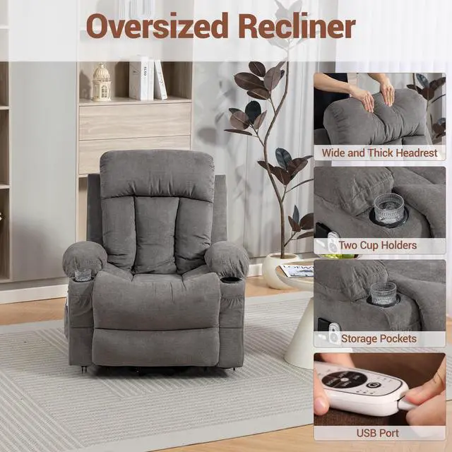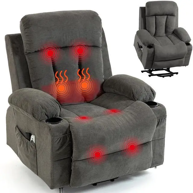 This power lift recliner chair for elderly combines massage, heat, and lift functions to provide ultimate comfort and mobility support. The electric oversized recliner sofa features 8 vibration points, lumbar heating, and a smooth lift mechanism that helps seniors stand easily. Soft breathable fabric, overstuffed cushions, cup holders, storage pockets, and a USB charging port make this reclining chair a practical and cozy addition to any living room or bedroom.