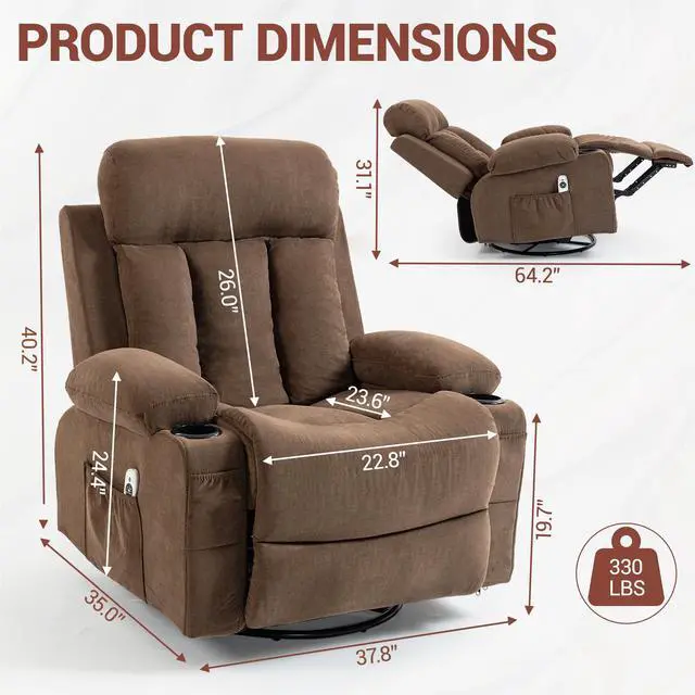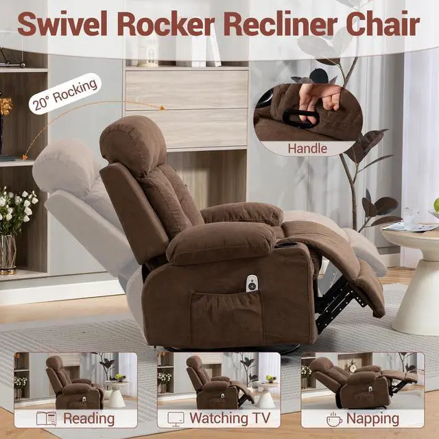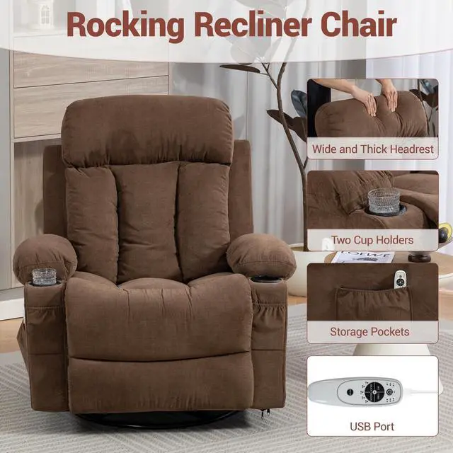 This Massage Rocker Recliner Chair with Vibration Massage and Heat combines relaxation, functionality, and modern comfort. Designed for adults, it features 360° swivel rotation, a 20° rocking function, and a reclining back up to 160° for full-body support. The soft breathable fabric, sturdy metal frame, and ergonomic cushioning ensure lasting comfort whether youre reading, watching TV, or taking a nap. Perfect for the living room, bedroom, or nursery.