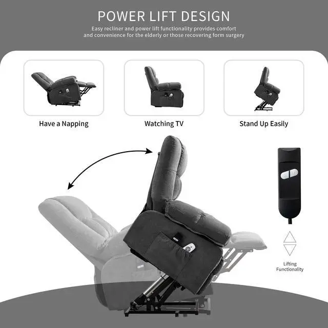 Power Lift: Features a power lift function to assist seniors in standing up easily, with a smooth adjustment from its base to a maximum recline of 150 degrees, supported by an SGS-tested alloy steel frame with a 350lb capacity.