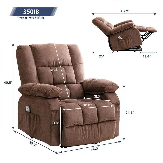 Power Lift: Features a power lift function to assist seniors in standing up easily, with a smooth adjustment from its base to a maximum recline of 150 degrees, supported by an SGS-tested alloy steel frame with a 350lb capacity.