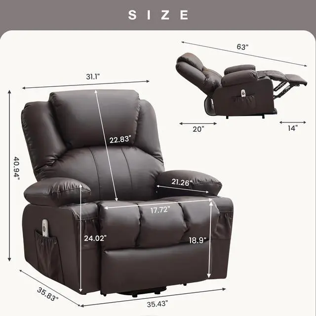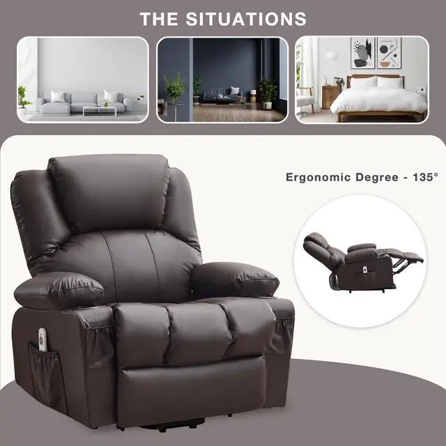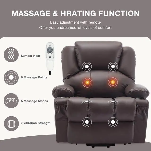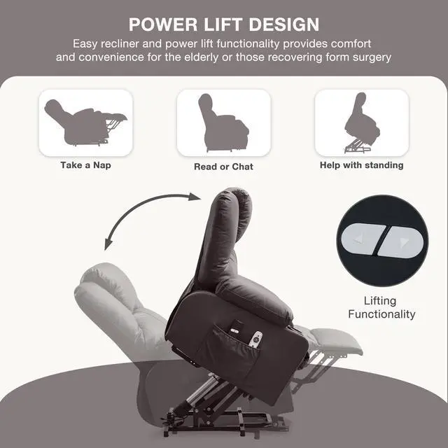 Power Lift: Features a power lift function to assist seniors in standing easily, with smooth adjustment up to 150 degrees via remote control, supporting up to 350 lbs.