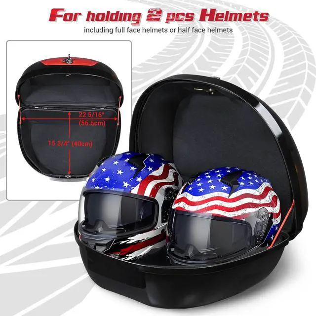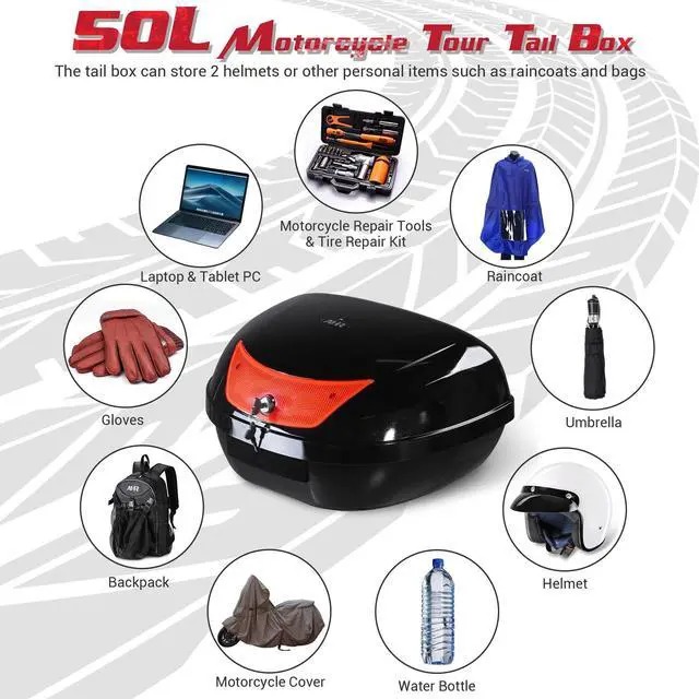 - 50L Large Capacity - 24"x17"x12" Motorcycle Tour Tail Box features 50L large storage capacity, spacious enough to store 2 pcs AHR full face helmets, gloves, air pumps, motorcycle covers, laptops, cameras, motorcycle repair tools, travel toiletry bags, raincoats, etc., suitable for commuters or travelers