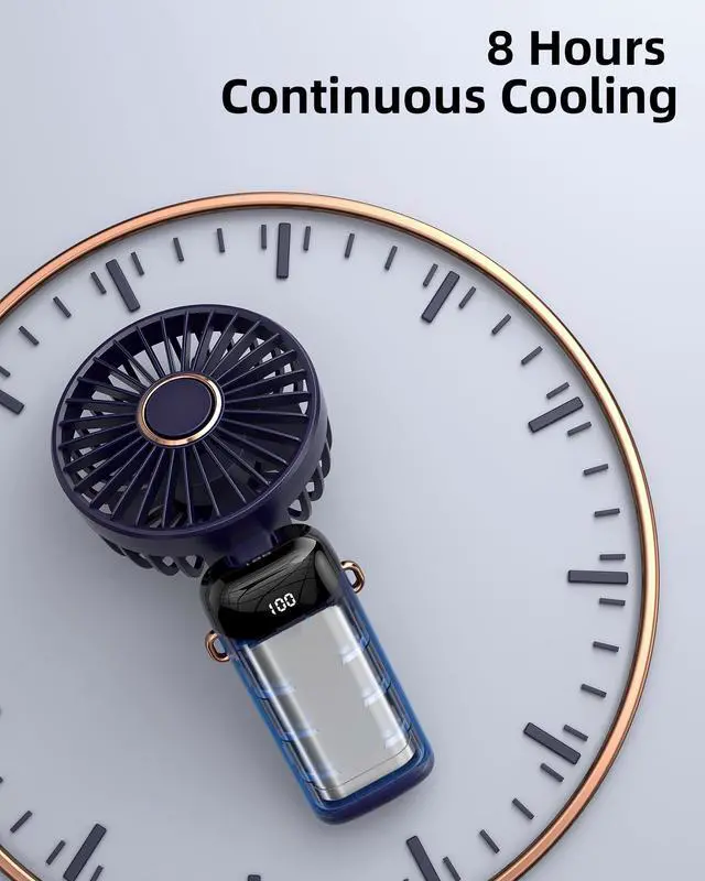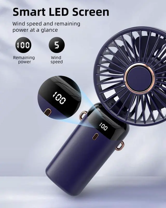 The rechargeable mini fan is equipped with a smart digital screen that conveniently shows the remaining battery life and speed level.