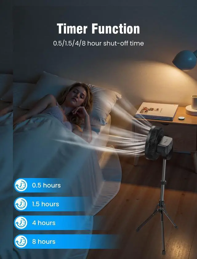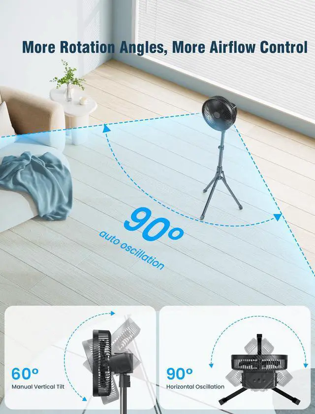 10 FOLDABLE CAMPING FAN & ADJUSTABLE HEIGHT: Features a sturdy tripod with rubberized feet for stability on grass, sand, or uneven terrain. Extendable from 27.7" to 47" with tilt-adjustable head. Compact foldable design for travel/camping storage