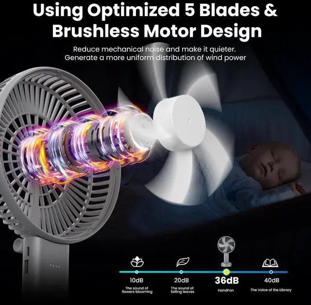 Large frame design with 5 blades, this handheld fan can blow much stronger airflow than general handheld fan. 6 settings of air flow can be adjusted according to your demand, cooling you down instantly.