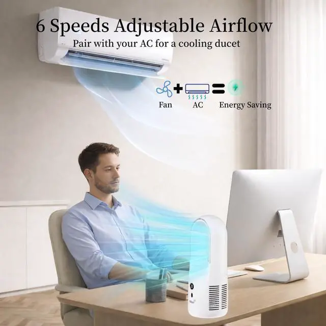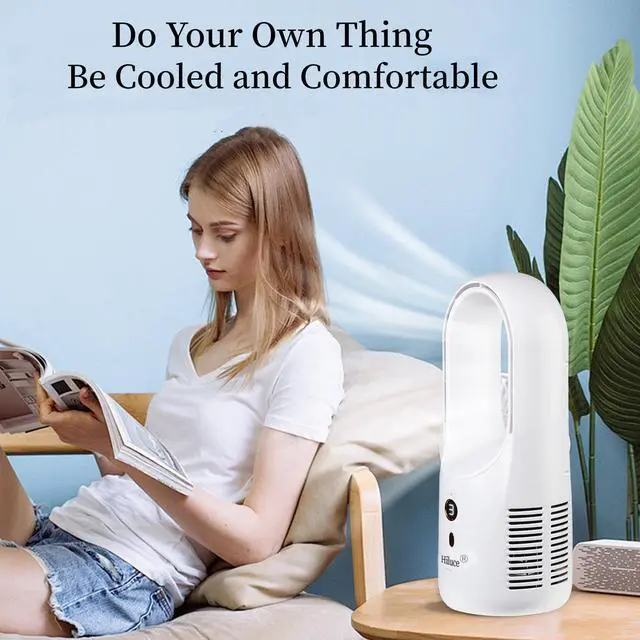 Stay cool and comfortable with our bladeless mini fan - With its compact size and rechargeable battery, this fan is both portable and convenient, making it the ideal choice for travel, home, or office use. Its quiet performance ensures that you won't be disturbed while you work or sleep, and its oscillating feature provides a gentle breeze throughout the room. Whether you're looking for a small fan for your bedroom or a cooling fan for your office, our mini fan is the perfect choice. Plus, it makes a great gift for anyone who needs to beat the heat!