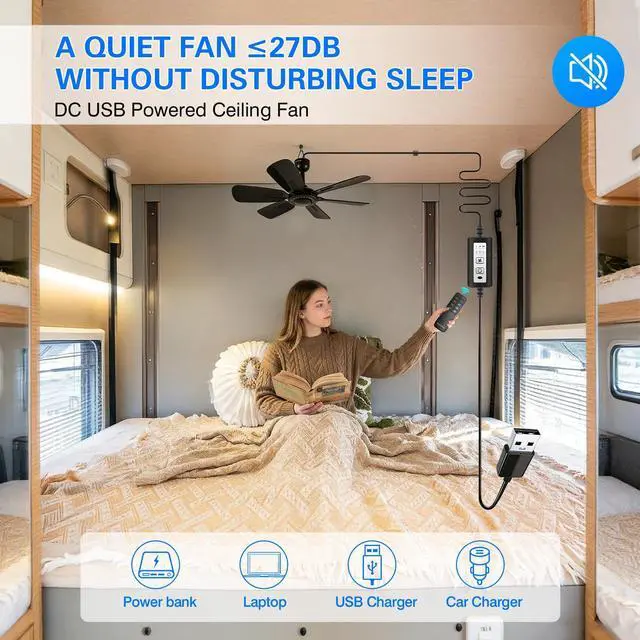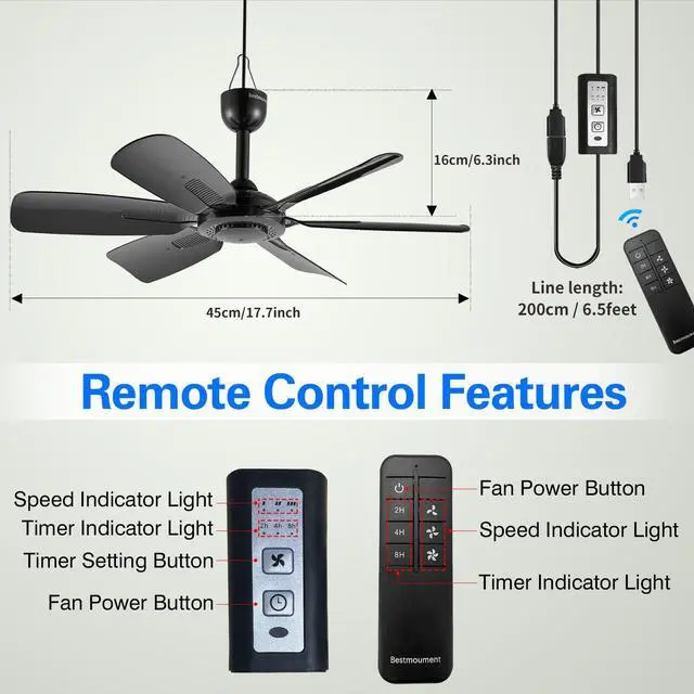 REMOTE CONTROL FUNCTION: Ceiling fan with remote control, you can choose four wind speed: light, gentle, moderate . With timing function, no worry about catching a cold at midnight. that can be powered by a laptop, PC, Solar battery, power bank, USB charger, wall charger with a USB port, and more. Use a USB power source above 2A for extra cooling from higher fan speeds.