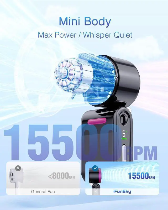 Super Powerful, Ultimate Cooling ExperienceThe iFunSky handheld fan features a 4th-gen high-speed airflow system with a high-speed three-phase brushless motor, delivering a maximum wind speed of 10m/s. With a top speed of 15,500 RPMit's perfect for staying cool during hot journeys.