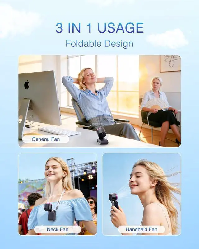 Handheld, Desktop & Neck Fan All in One Features a 180° foldable design and an adjustable lanyard for easy switching between handheld, desktop, and neck modes. Whether you're commuting, working at your desk, or exploring the outdoors, this 3-in-1 portable fan keeps you cool and comfortable in any situation.