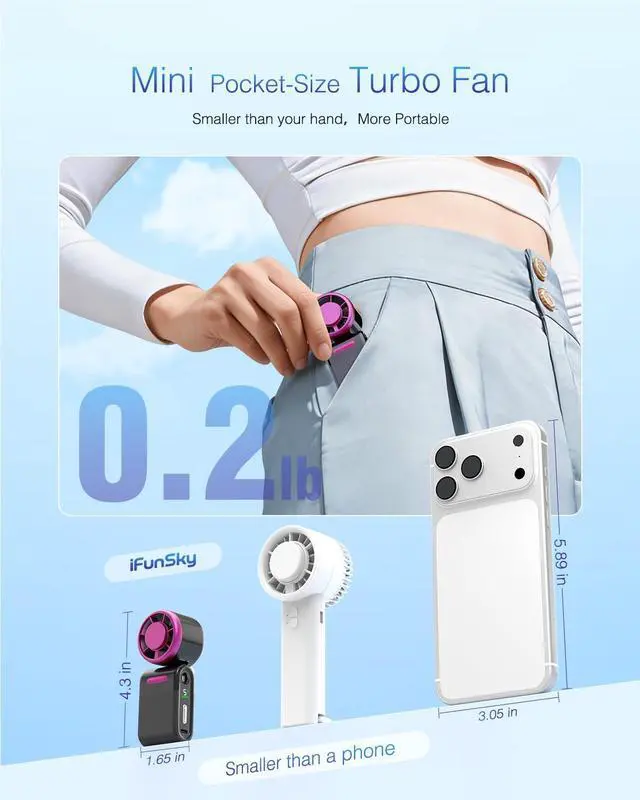 Mini Pocket Size Turbo FanPerfect GiftWith its ultra-compact size of just 1.65 x 4.3", it fits easily into even the smallest pockets. An ideal summer gift for men, women, kids, seniors, and anyone needing relief from makeup, hot flashes, or summer heat.