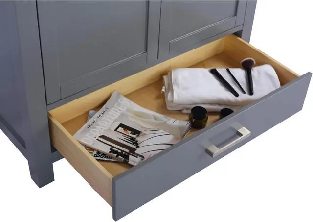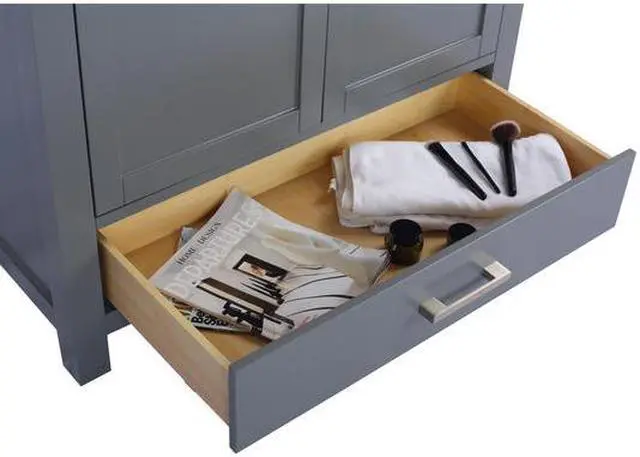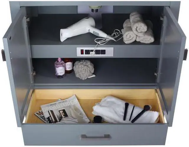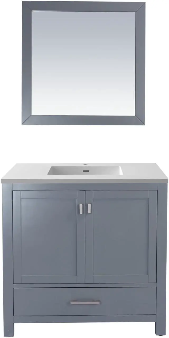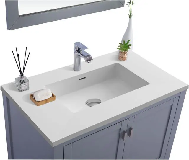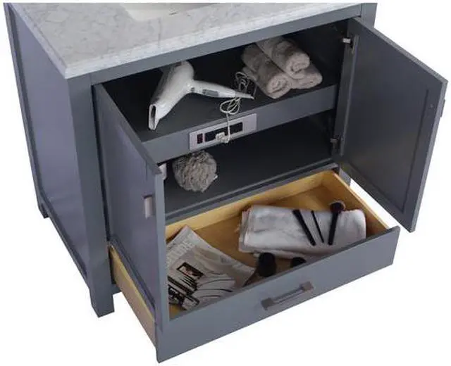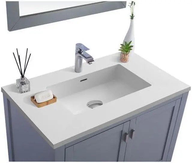 313ANG-36G-MW Wilson 36 - Grey Cabinet + Matte White VIVA Stone Solid Surface Countertop, The Wilson Collection is a uniquely simple yet attractive collection. It features recessed panel doors with a shaker style design that is inset within the cabinet frame. The shaker style cabinets is inspired by the furniture designed by the Shakers, who were extremely skilled craftsmen and carpenters. Not sacrificing quality, the Wilson Collection is constructed with solid Oak wood, includes high quality soft closing rails and hinges, and a solid wood, dovetail construction drawers. Additionally, with functionality in mind, there is a 4 outlets plug to keep all your electronics plugged in and ready to use. This collection offers a variety of colors and sizes to fit your bathroom.