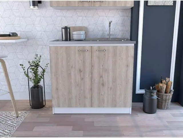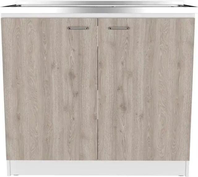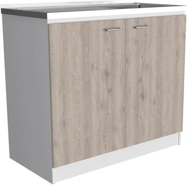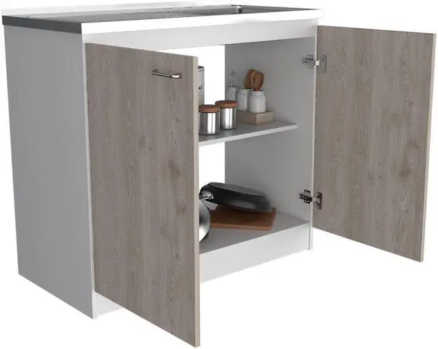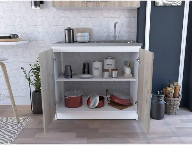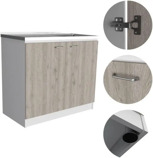 Oklahoma utility Sink. The vanity base strikes a rectangular silhouette, featuring a two-tiered shelving unit inside perfect for storing pots and pans or placing a basket of accessories, while two cabinet doors provide private storage for anything else you might need. Features an integrated steel sink. Complete the Oklahoma look with a matching Oklahoma wall cabinet. *****FAUCET NOT INCLUDED**** Designed with elegant white-light gray manufactured wood finish.
