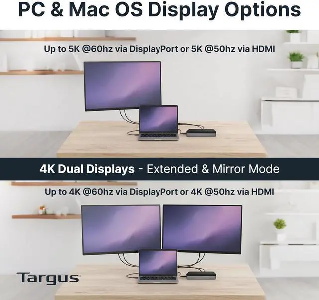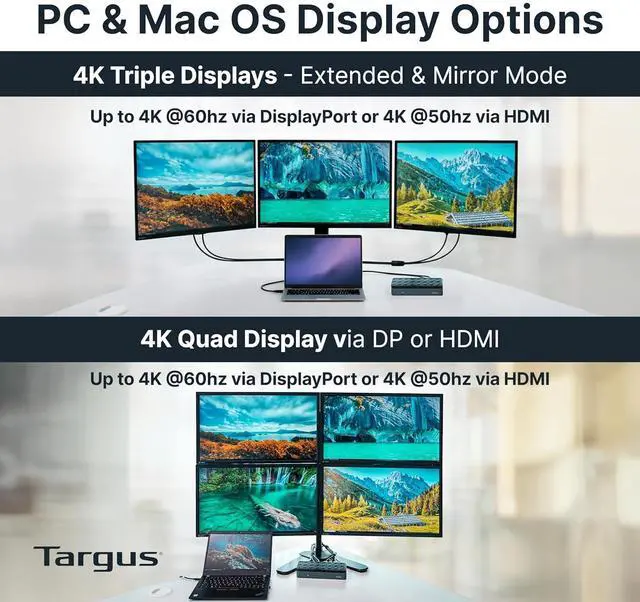 SINGLE 5K & FOUR 4K UHD DISPLAYS - Supports single 5K and four 4K UHD displays via four DisplayPort (3840 x 2160 p60) or four HDMI (3840 x 2160 p50) ports (or combination of). You' ll love your crisp and clear monitor display with this dock.