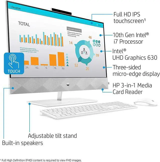 INTEGRATED DISPLAY & GRAPHICS: 27" diagonal widescreen Full HD (1920 x 1080) IPS BrightView WLED-backlit three-sided micro-edge touch-screen monitor. Smoothly stream 4K content and play your favorite games with Intel UHD Graphics 630