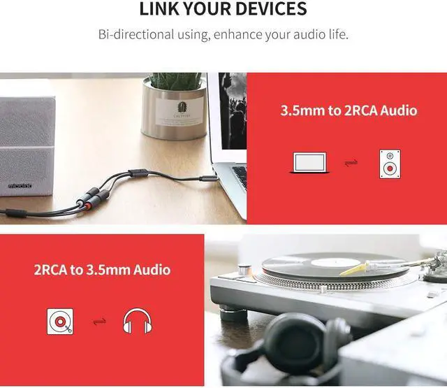 3.5mm Stereo Male to 2 RCA Female adapter cable is ideal for adapting the output of your PC, or personal audio to stereo RCA jacks for a quick transition from headphone to RCA connection.