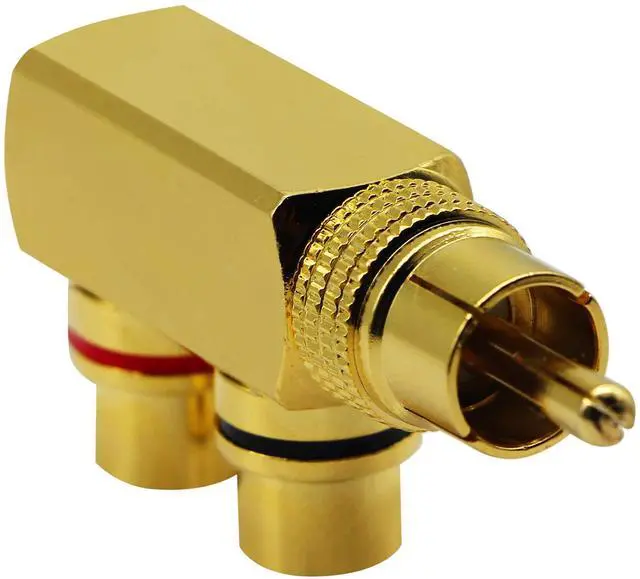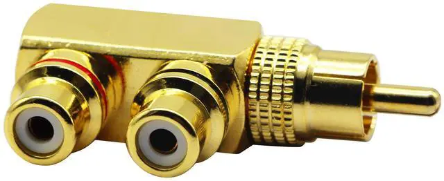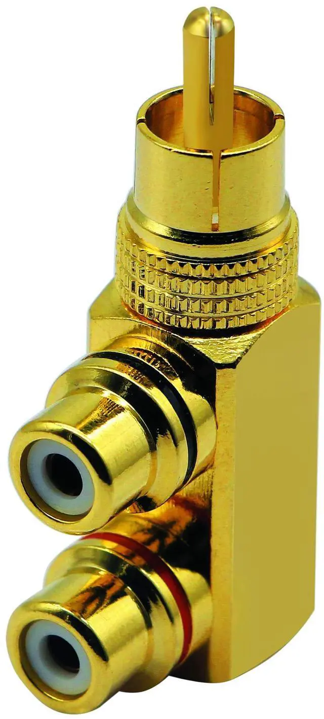 Features:90 Degree Right Angle RCA Male to 2 RCA Female Plug Connector