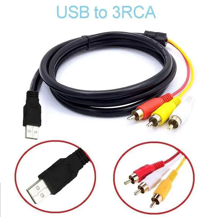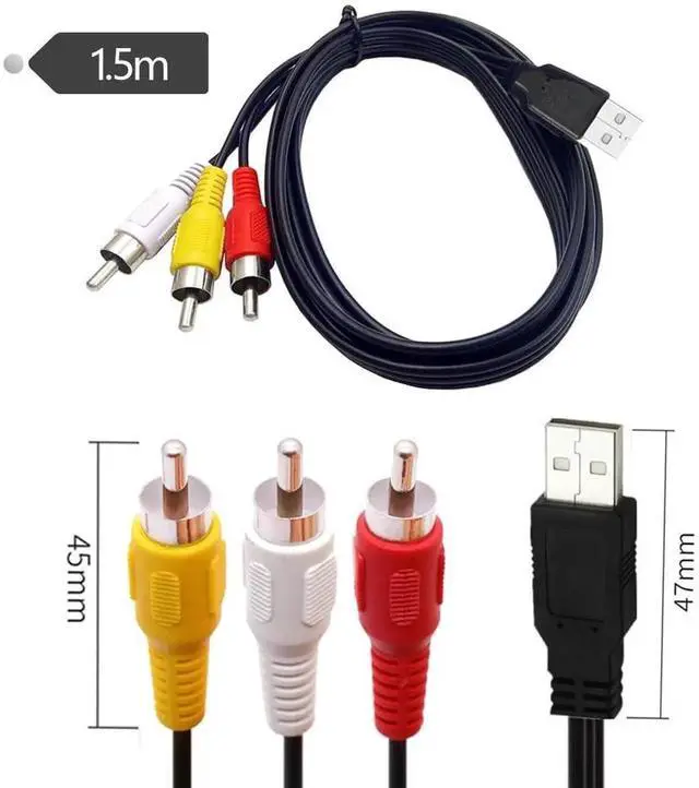 USB to RCA Cable, 1.5m USB Male to 3 RCA Male Jack Splitter Audio Video AV Composite Adapter Cable, for USB-enabled TVs, PCS, computers, smart phones and more USB decices. Compatible with a wide range of devices, this usb to 3 rca cable is perfect for connecting devices such as DVD players, HDTV receivers, TV sets, projectors, and AV receivers. It's the perfect solution for enjoying high-quality audio and video.