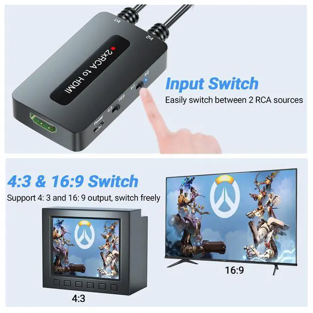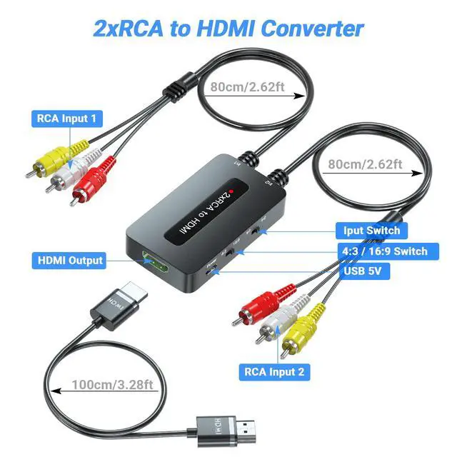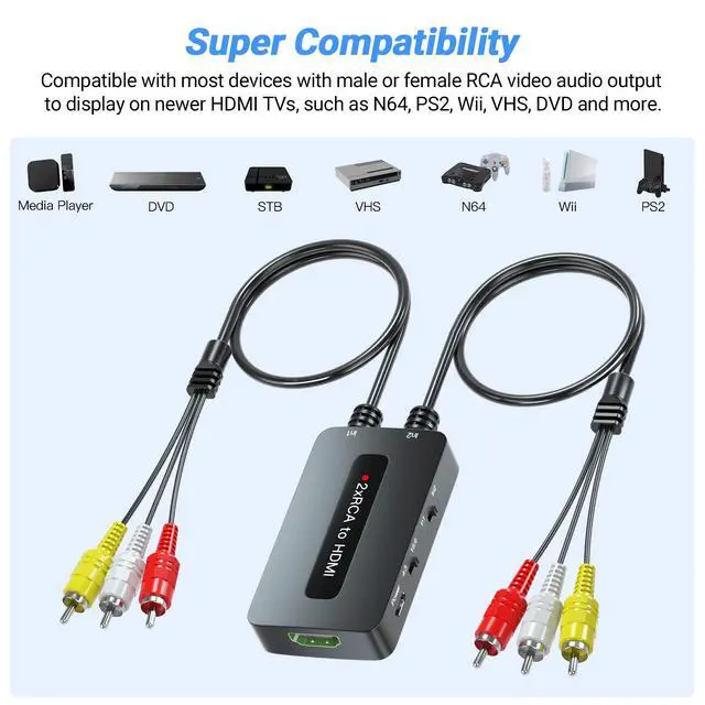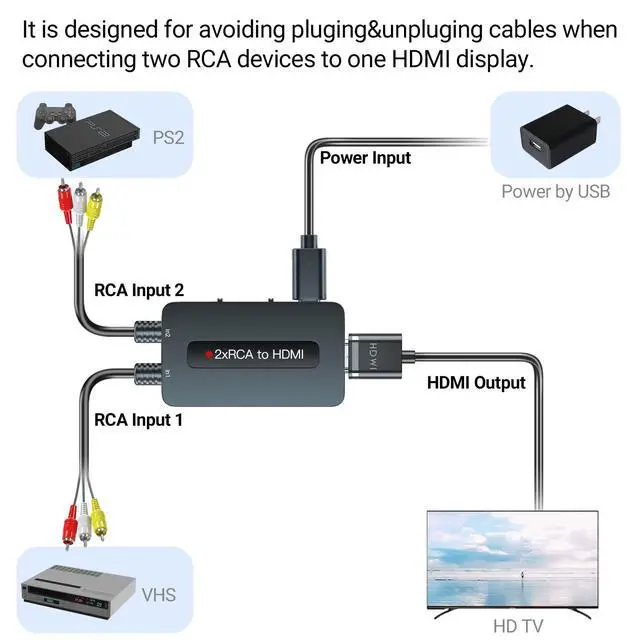If you want to connect two RCA devices to one HDMI TV and face the problem of frequent plugging and unplugging, this dual port AV to HDMI converter is the perfect solution you need.