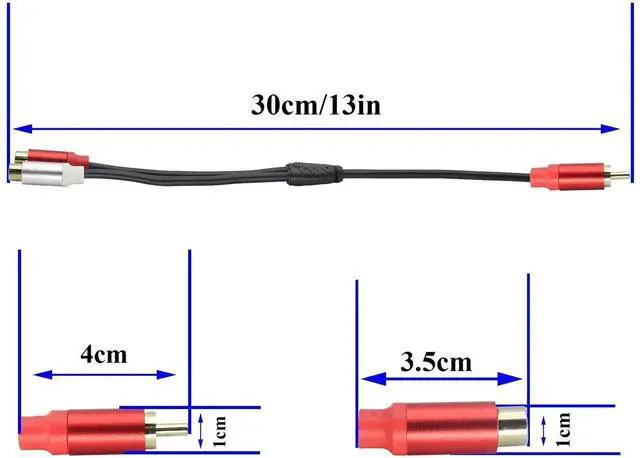 Size: (30CM/12in) Color: (black) Packaging quantity: (1 pack) Material: High flexibility PVC material. Connector 1: Red RCA female plug+white RCA female plug (connected to TV or display screen for audio transmission), Connector 2: Red RCA male plug (connected to audio). Provide clear and smooth optimal signals.