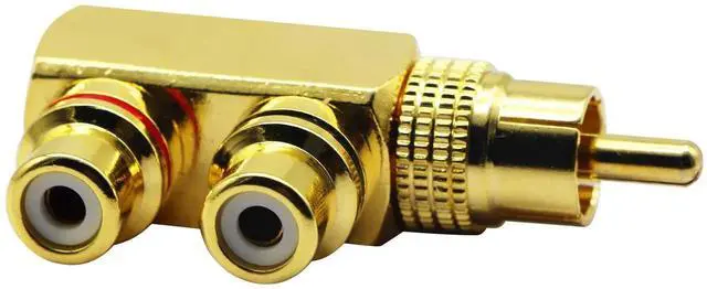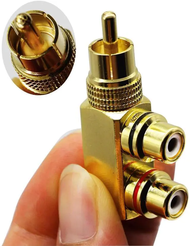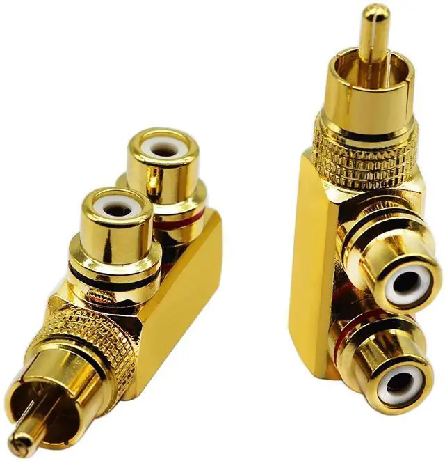 Size:(4.8CM x2.4CM) Colour:(Gold) Package Quantity:(2 pack) Material:copper Metal plated gold Features:90 Degree Right Angle RCA Male to 2 RCA Female Plug Connector