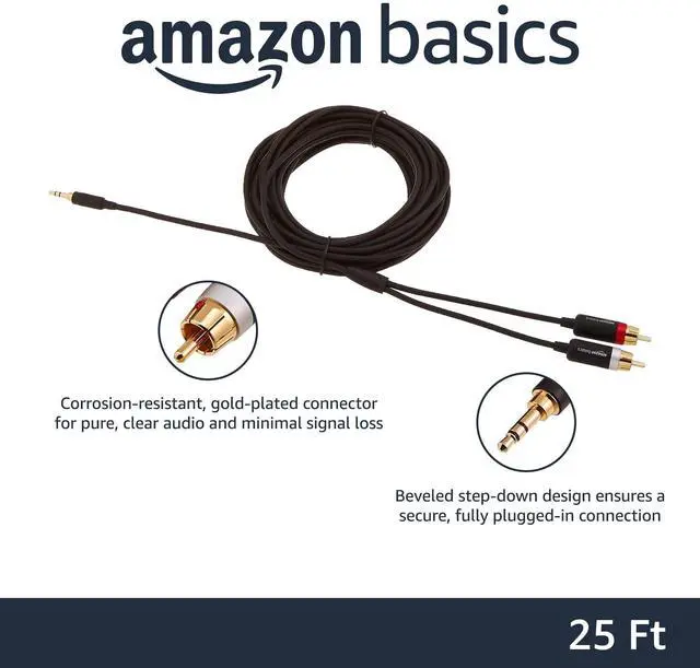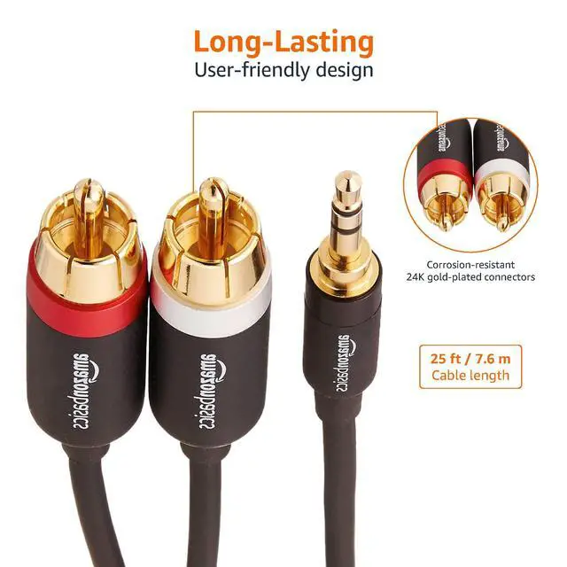 3.5mm Stereo Audio Cable to 2 RCA Adapters for Amplifiers, Smartphone, Tablet, Active Speakers with Corrosion-Resistant Gold-Plated Plugs, 25 Feet/7.6 m, Black