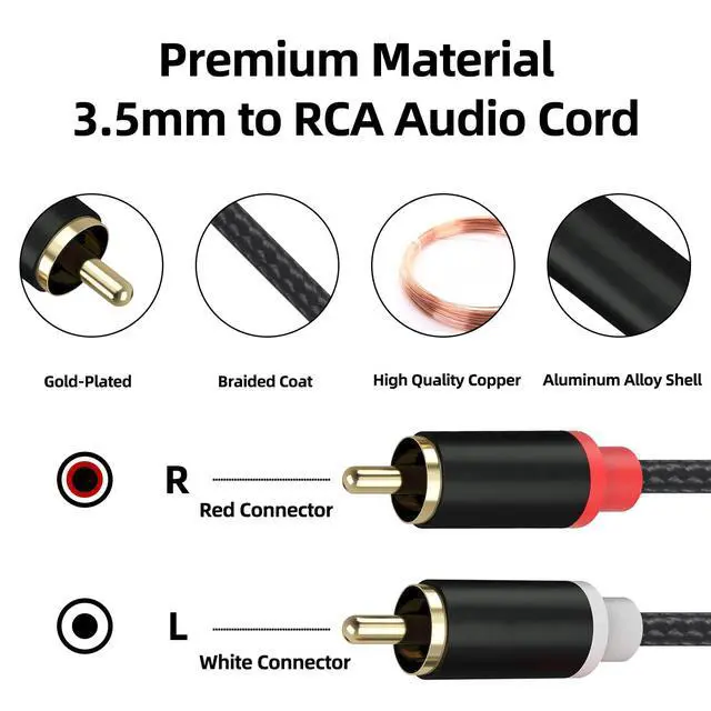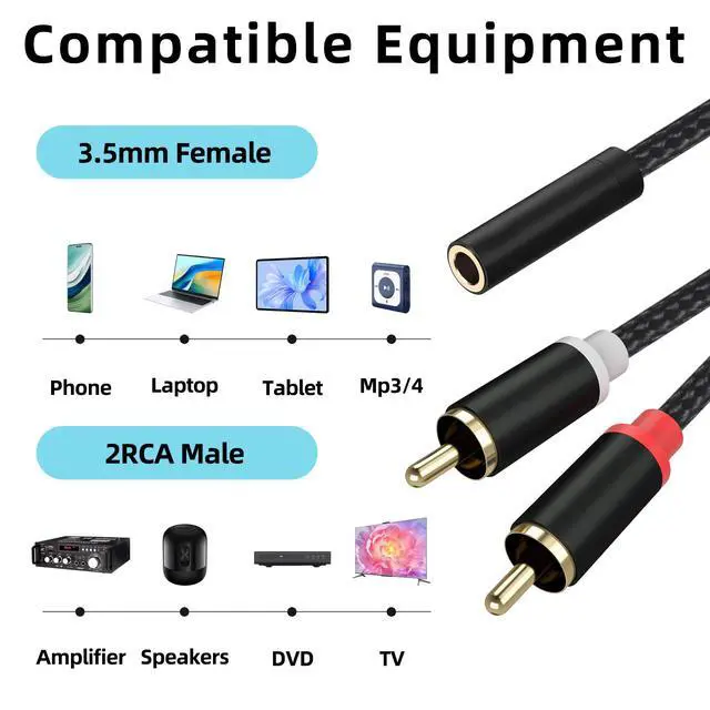 Universal Compatibility: The Mini Jack to 2RCA Phono Stereo Audio Cable is compatible with devices with 3.5mm aux ports such as smartphones, tablets, PCs, and MP3 players for connecting to popular audio equipment with RCA ports, including stereo receivers, amplifiers, TVs, projectors, radios, and more.