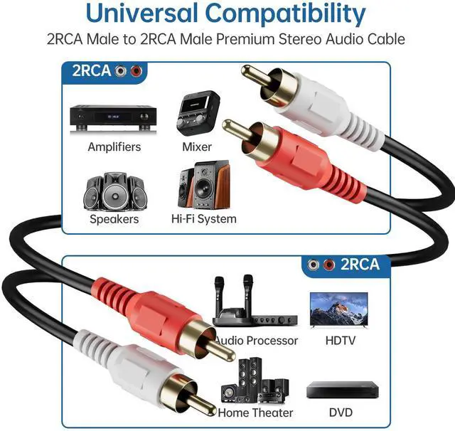 Universal compatibilityDual RCA male to male frequency line supports all devices with RCA audio interfaces, such as DVD players, CD players, subwoofers, and TVs.