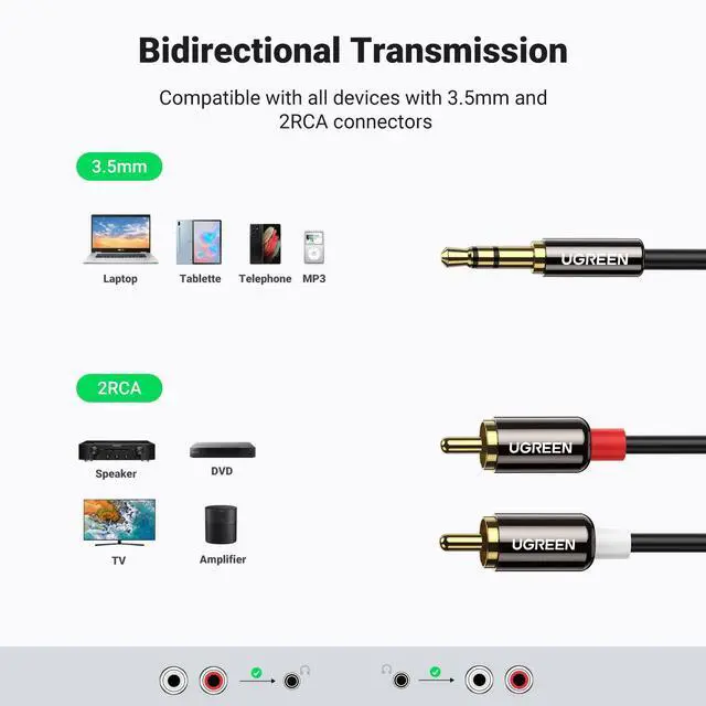 3.5mm to 2RCA Audio Cable: The 3.5mm to 2RCA stereo cable is suitable for plugging the 3.5mm connector into the headphone jack of your mobile device and the 2 RCA connector to the port on your sound system. This RCA to Aux cable is a perfect choice for audio connections both in professional and domestic settings.