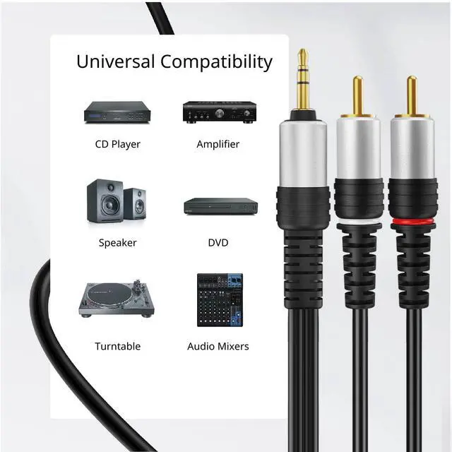 Easy to Use Output Audio Cable - Connects portable audio devices compatible with a standard 3.5mm audio port to a TV, AV receiver, amplifier, projector, radio, car audio, stereo system, Hi-Fi audio, computer sound, recording equipment, speakers, and more.