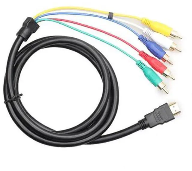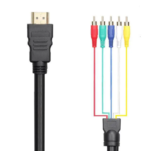HDMI male to 5 RCA audio video AV cable with 24K gold-plated connectors for enhanced signal transmission, designed for all HDMI standards. Transfer digital video signals at a rapid speed of 5 Gbps per second.