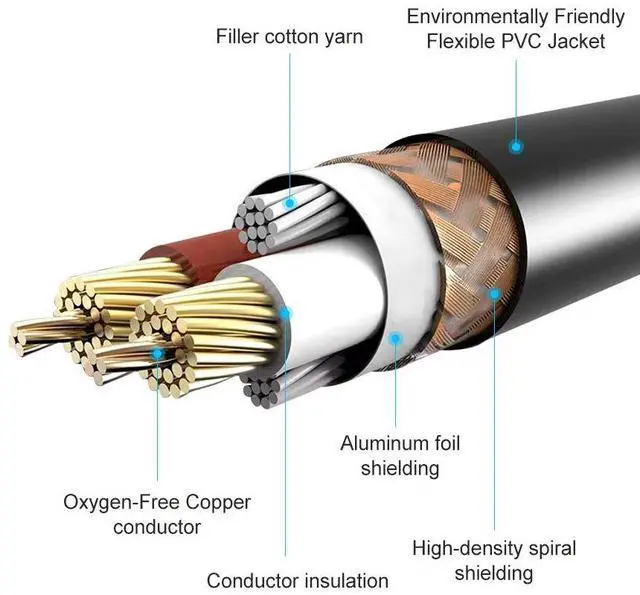 Excellent Sound Heavy-duty and high-density shielding provides effective EMI and RFI suppression while ensuring flexibility. This ensures high-quality audio transmission without static or interruptions. Corrosion-resistant materials and excellent signal quality are achieved through Oxygen Free Copper lines combined with double shielding, reducing distortion and signal loss, minimizing return loss, ensuring that music, dialogue, and sound effects are always clear and detailed.