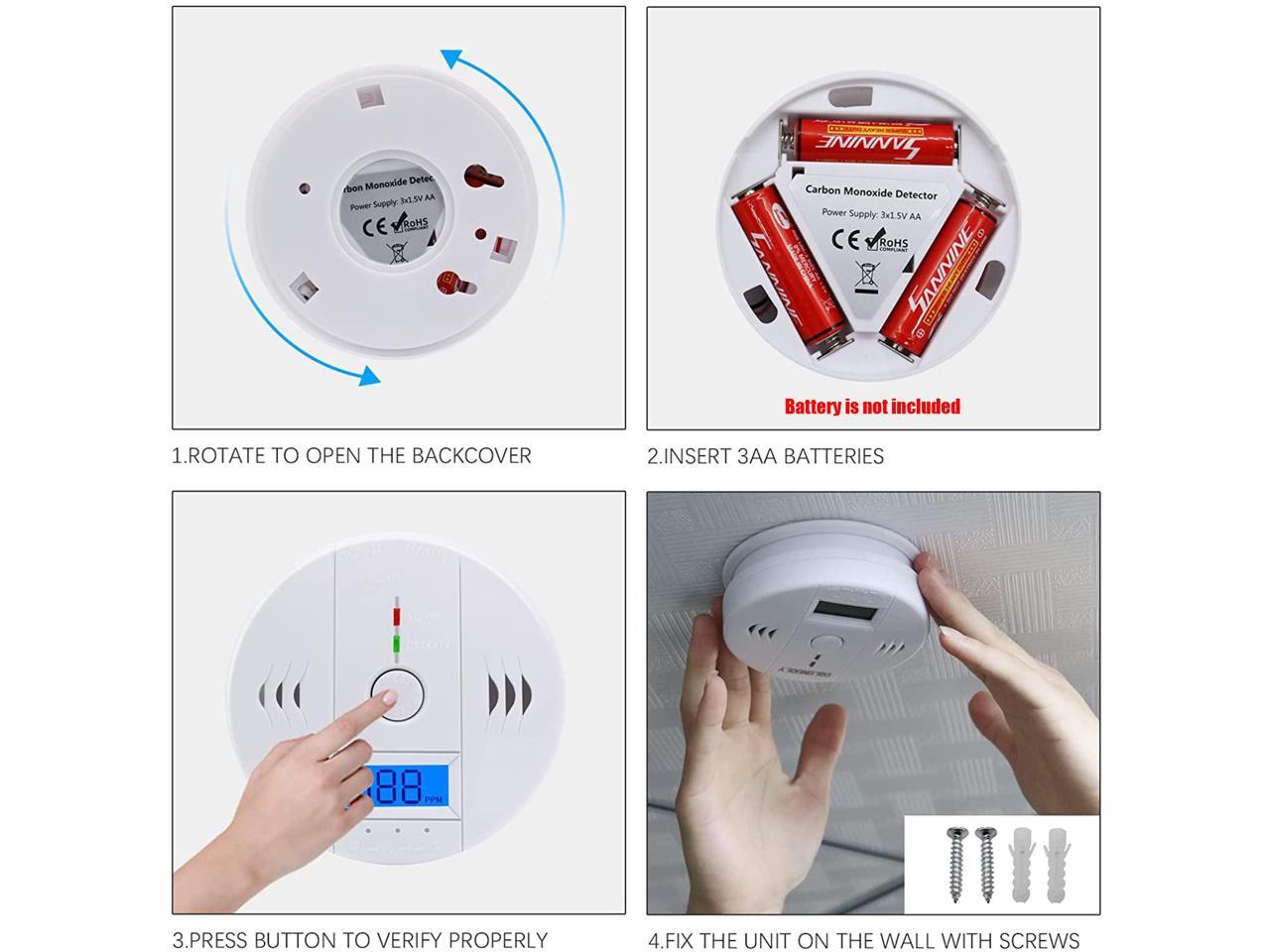 - ENERGY SAVING --- Operated by three 1.5V AA Batteries (not included), The alarm sound pattern is 4 beeps every 5seconds for the first 4 minutes. In 4 minutes, it will change to 4 beeps every minute to save the battery