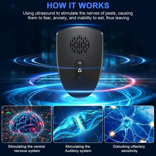 • Ultrasonic insect indoor repellents use ultrasound to disrupt the nervous systems of pests. Long term stimulation can interfere with pest behavior, thereby helping to repel pests like mice, rats, roaches, ants, spiders, and mosquitoes