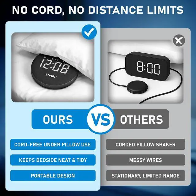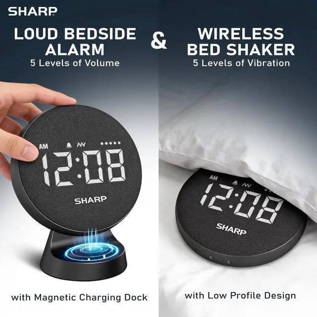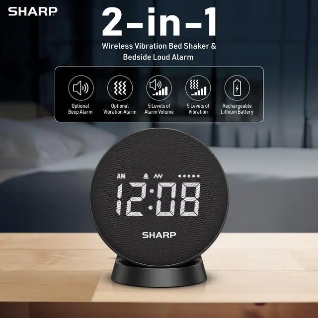 The SHARP Vibrating Super Loud Alarm Clock is a fully integrated vibrating alarm clock with no wired puck—place under your pillow for discreet, powerful wake-ups at home or travel. Rechargeable battery lasts up to 29 hours per charge. Choose Beep, Vibration, or Beep + Vibration with 5 volume and 5 vibration levels. Designed for heavy sleepers, hard-to-wake adults, teens, shift workers, and shared bedrooms.
