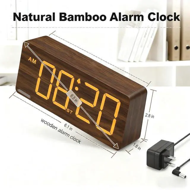 This wooden digital alarm clock offers a stylish and practical design. It features large, easy-to-read numerals, adjustable brightness levels, and customizable alarm volume. It's a versatile and reliable choice for any room. Discover the convenience of our plug-in clock, featuring a continuous time display, ensuring you never miss a beat. This wooden bedside clock, with battery backup for alarm and time settings, ensures your alarm will sound even during a power outage, so you never have to worry about oversleeping. This nightstand clock features adjustable volume, providing a better waking experiencenot too loud to startle you, nor too bright to wake you.