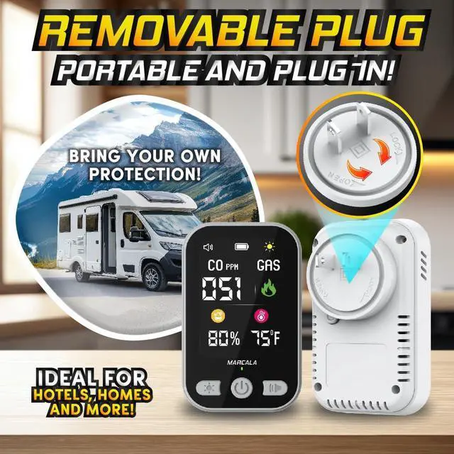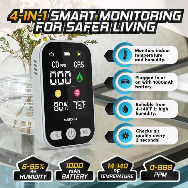 2026 V2.0 Advanced 4-in-1 Detection - UPGRADES SENSORS - PROTECT YOUR HOME with MARCALA's advanced 4-in-1 carbon monoxide detectors travel, combining NATURAL GAS, CARBON MONOXIDE, temperature, and humidity sensors in one powerful unit. Stay INFORMED AND SECURE with REAL TIME MONITORING that helps DETECT HIDDEN DANGERS!