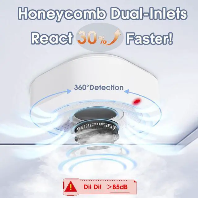 When the smoke concentration reaches a critical level, an 85dB alarm (audible within three meters) will be activated, accompanied by flashing red lights.