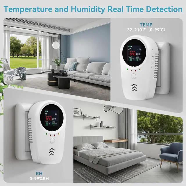 5-in-1 Carbon Monoxide Detectors,Plug-in Gas Detector with Rechargeable Backup Battery,Monitoring CO Natural Gas Temperature and Humidity Sound Light Alarm Detector,LCD Screen Brightness Adjustable