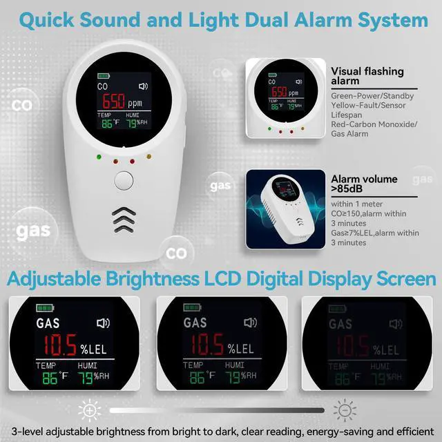 5-in-1 Carbon Monoxide Detectors, Plug-in Gas Detector with Rechargeable Backup Battery, Monitoring CO Natural Gas Temperature and Humidity Sound Light Alarm Detector, LCD Screen Brightness Adjustable
