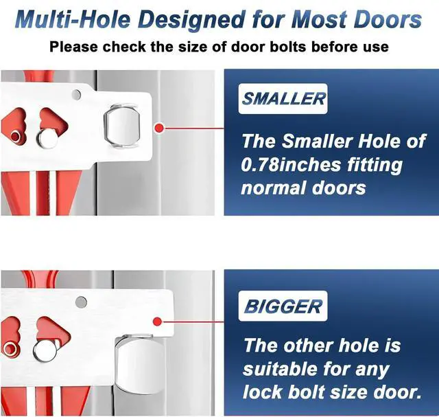 - The security portable door lock is an upgraded design with two sizes of through holes to ensure it can fit more types of inward opening doors.
