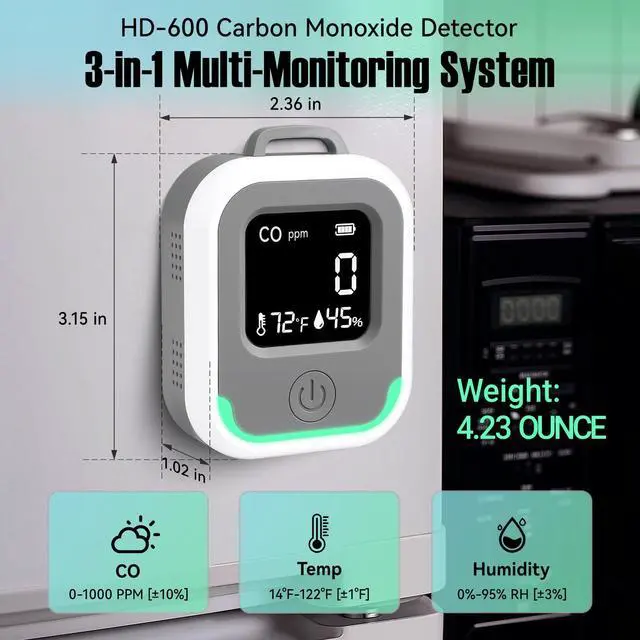Comprehensive 3-in-1 MonitoringAccurately monitors carbon monoxide (0-1000 ppm), temperature (14°F~122°F), and humidity (0%-95% RH) in real time. All three data points are displayed simultaneously on a clear screen for a complete overview of your air quality and comfort.