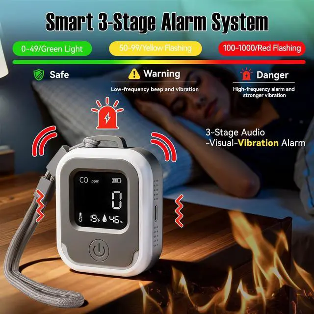 Smart 3-Stage Alert System: Featuring an intuitive smart alert system, it uses distinct colored lights and sounds to indicate danger levels: steady green for safe, low levels; flashing yellow with low-frequency beep and vibration from 50 PPM (warning); and rapid red flashing with high-frequency alarm and stronger vibration at 100+ PPM (danger), ensuring you're alerted promptly in any environment.