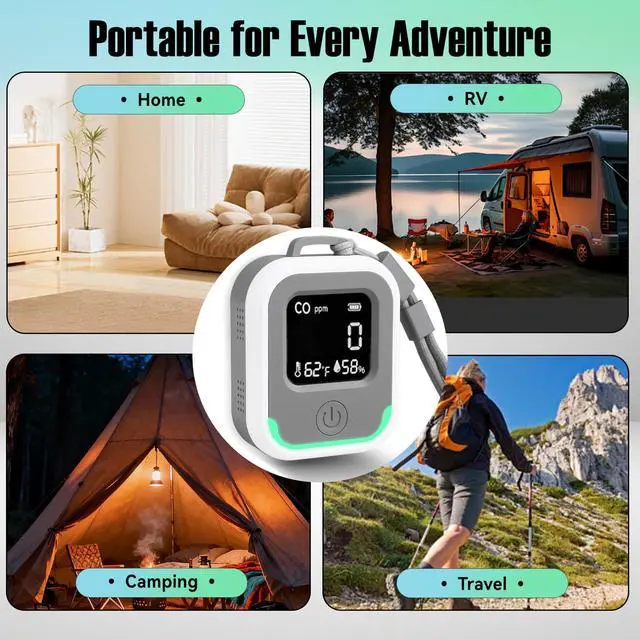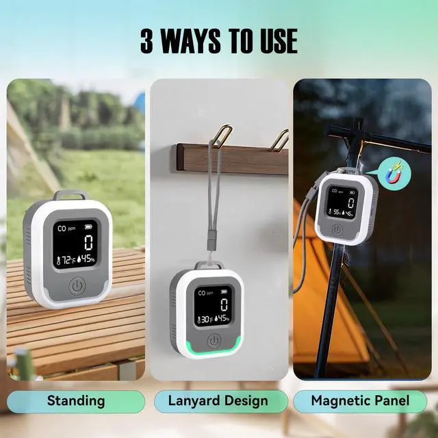 HD-600 Portable Carbon Monoxide Detector, 3-in-1 CO Alarm with Real-Time Temperature & Humidity Display, Audio-Visual Vibration Alert, Magnetic & Lanyard Mount for Home, RV, Camping, Travel