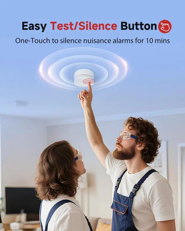 Easy to Install & One-Touch Control No wiring required. Mount this smoke detector quickly with screws or magnetic adhesive pads. The dedicated Test/Silence button makes weekly testing simple and allows you to silence nuisance or low-battery beeps for up to 12 hours. An 85 dB buzzer (at 10 ft) and LED indicators deliver clear fault and low-power alerts to keep you informed.